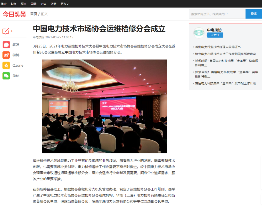 3月25日,2021年電力運維檢修技術(shù)大會暨中國電力技術(shù)市場協(xié)會運維檢修分會成立大會在蘇州召開,會議宣布成立中國電力技術(shù)市場協(xié)會運維檢修分會。