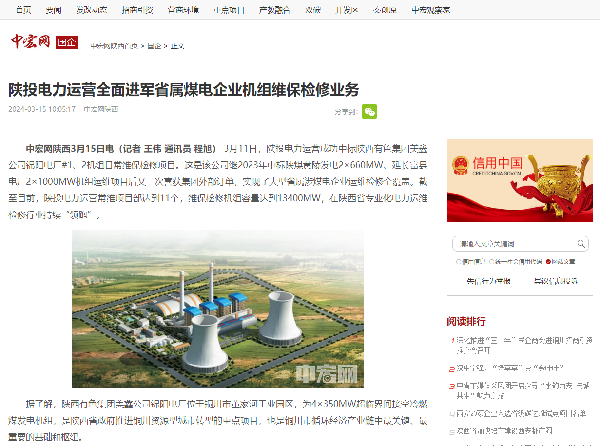 3月11日,公司中標(biāo)陜西有色集團(tuán)美鑫公司錦陽電廠#1、2機(jī)組日常維保檢修項目。這是公司繼2023年中標(biāo)陜煤黃陵發(fā)電2×660MW、延長富縣電廠2×1000MW機(jī)組運(yùn)維項目后又一次喜獲集團(tuán)外部訂單,實現(xiàn)了大型省屬涉煤電企業(yè)運(yùn)維檢修全覆蓋。目前公司常維項目部達(dá)到11個,維保檢修機(jī)組容量達(dá)到13400MW,在陜西省專業(yè)化電力運(yùn)維檢修行業(yè)持續(xù)“領(lǐng)跑”。